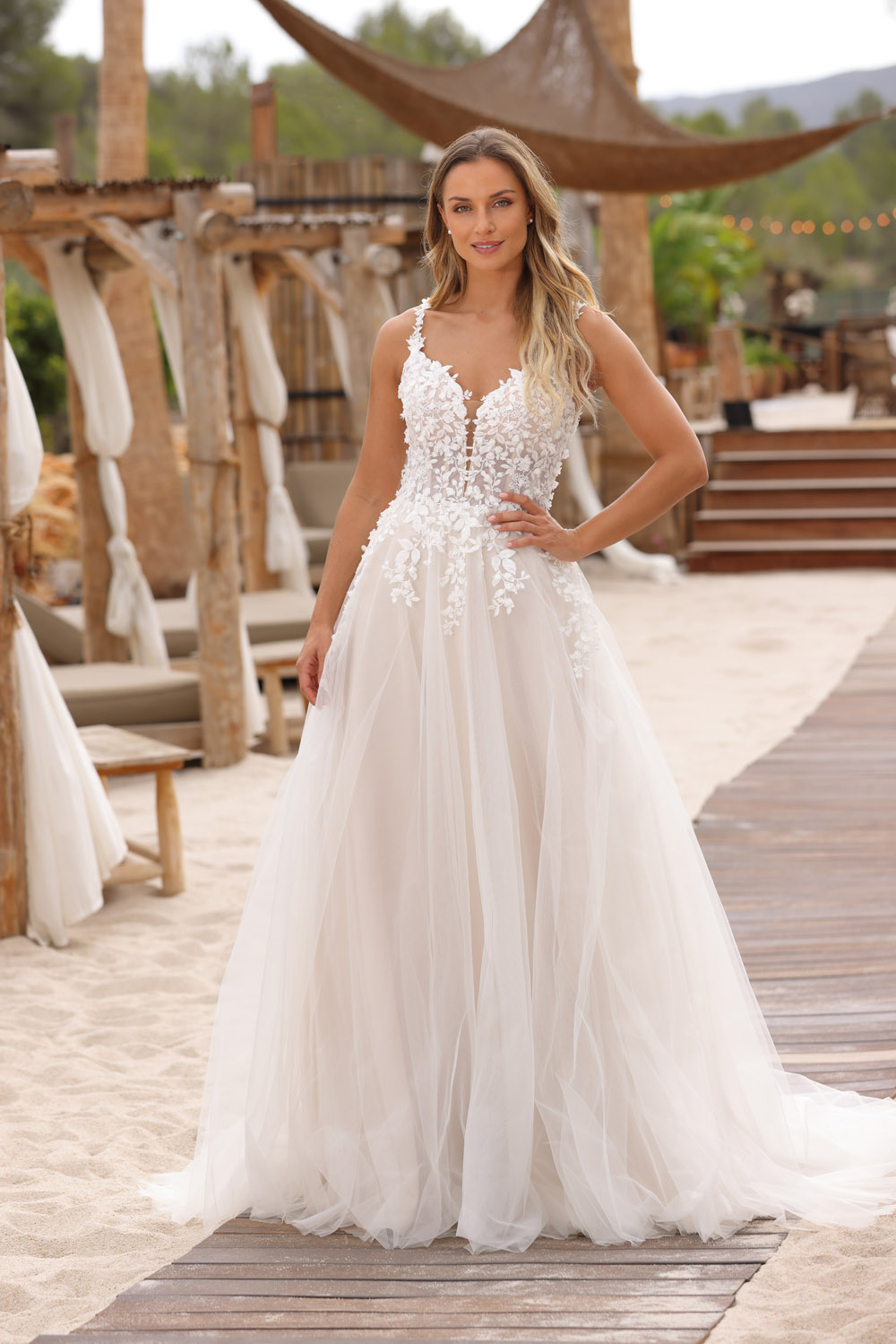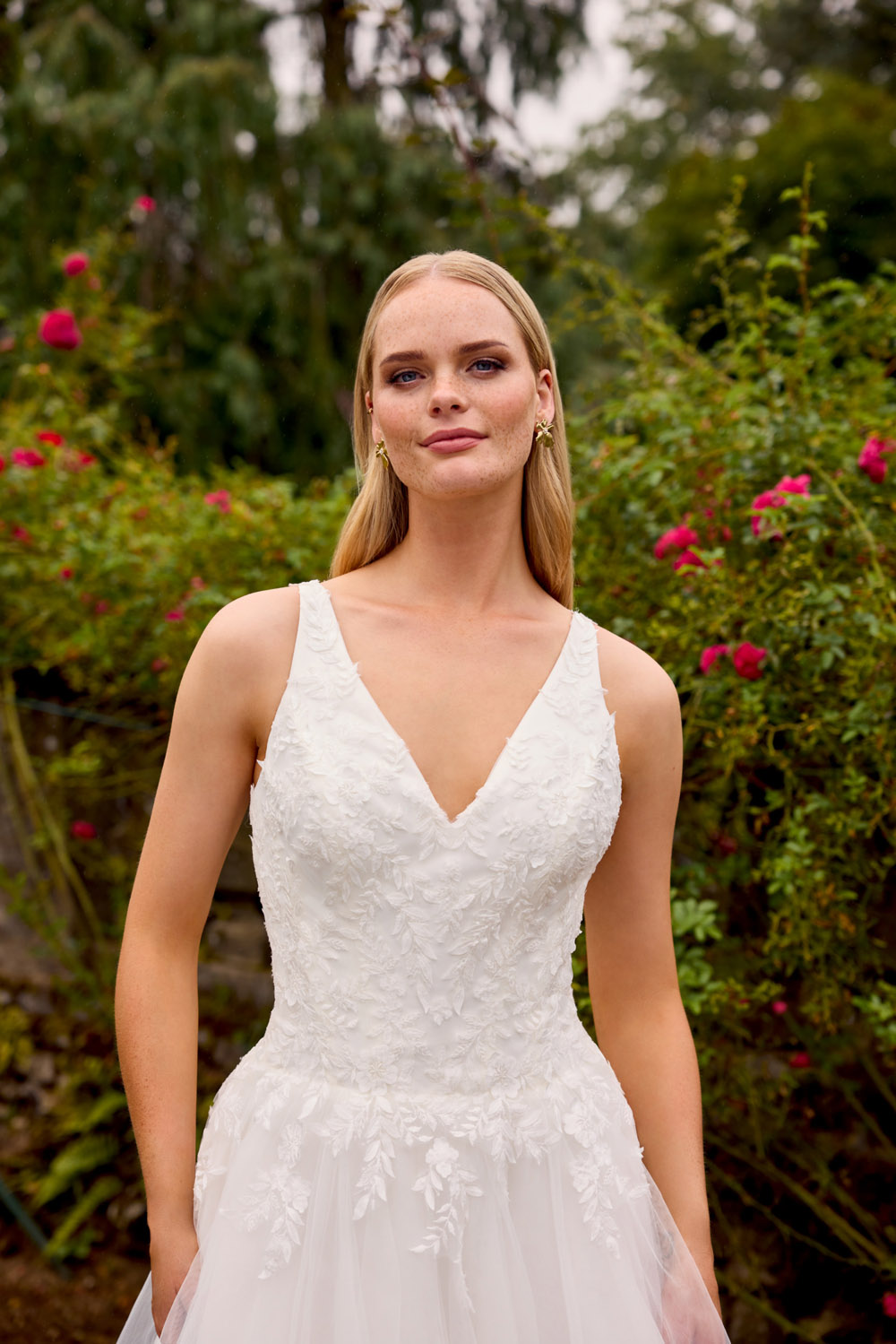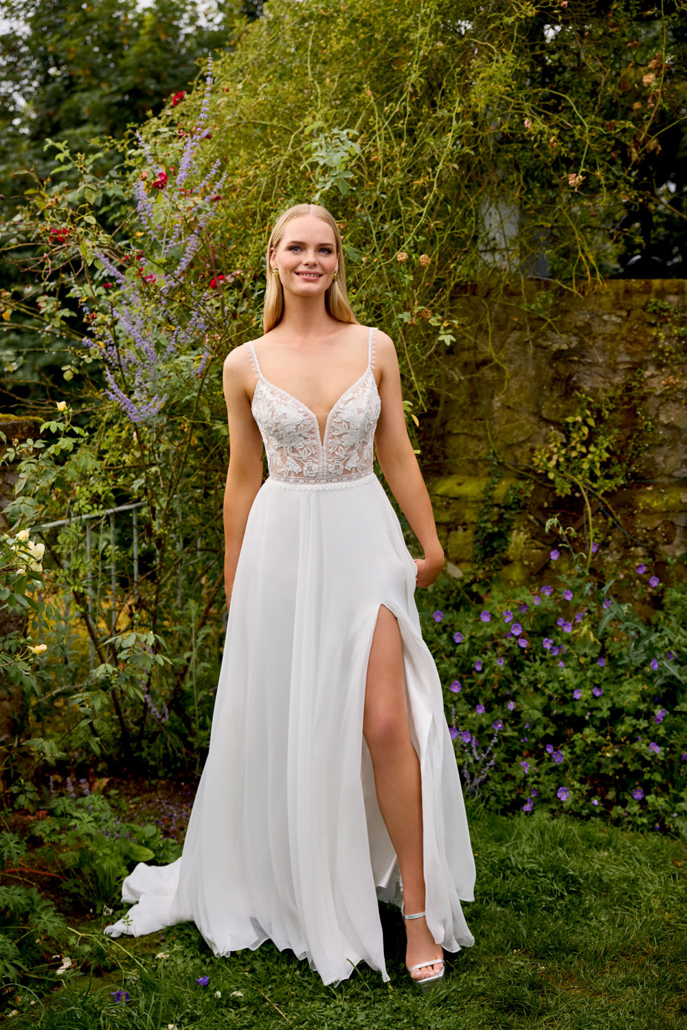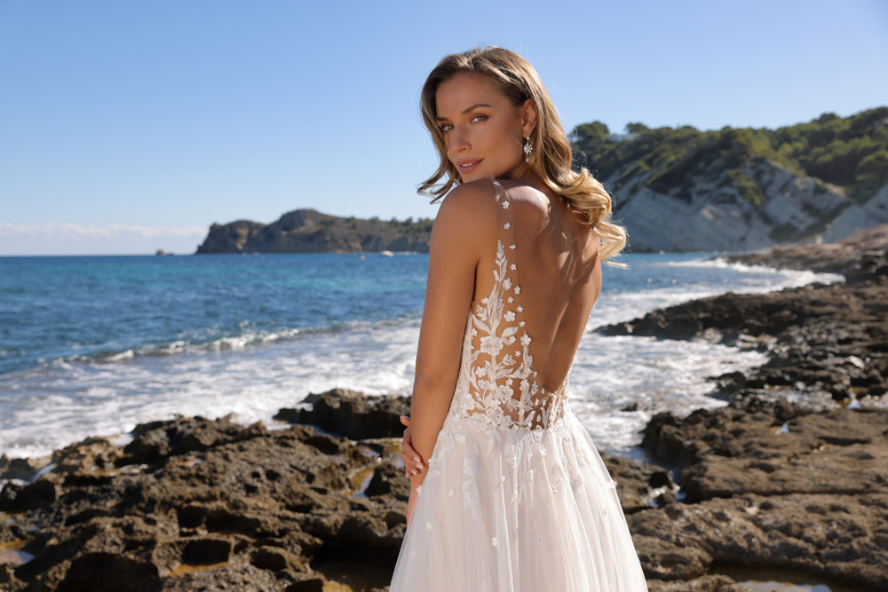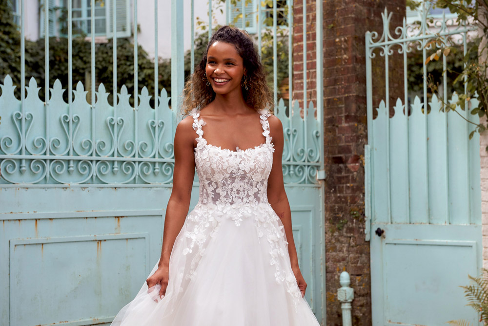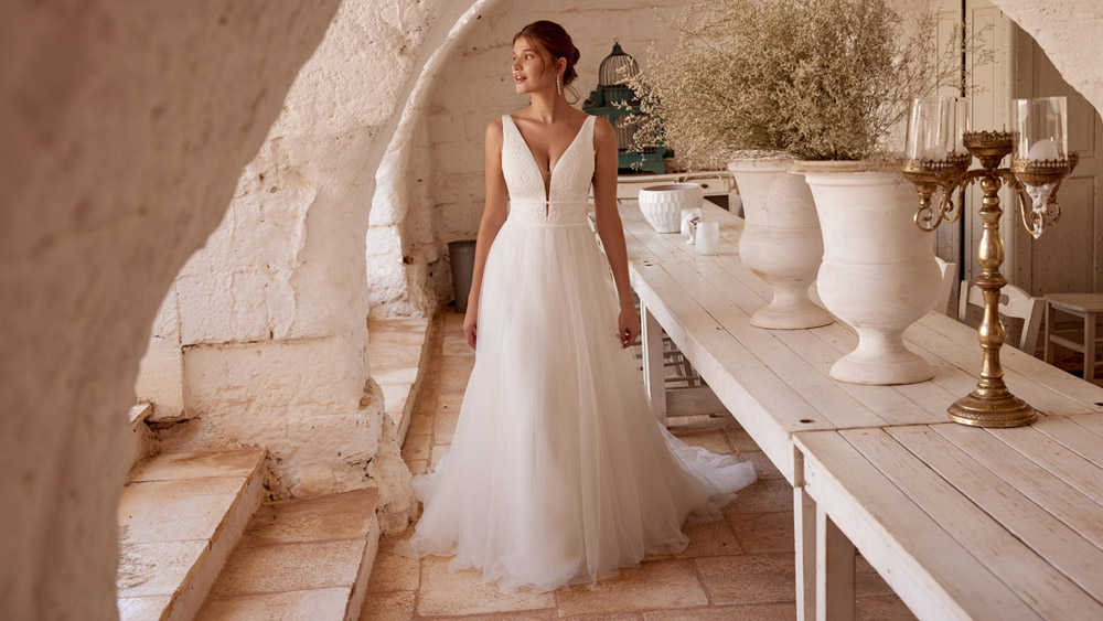 Die A-Linie erfreut sich als Schnitt bei Brautkleidern größter Beliebtheit. Es handelt sich um eine klassische Silhouette, die am Oberkörper eng anliegt und ab der Taille nach unten hin ausgestellt ist, ähnlich dem Buchstaben „A“. Diese Schnittform schmeichelt den meisten Körpertypen, indem sie die Taille betont und geschickt die Hüften, sowie Oberschenkel umspielt.
