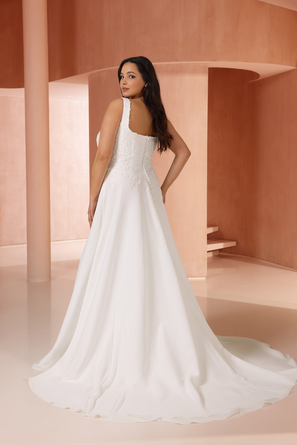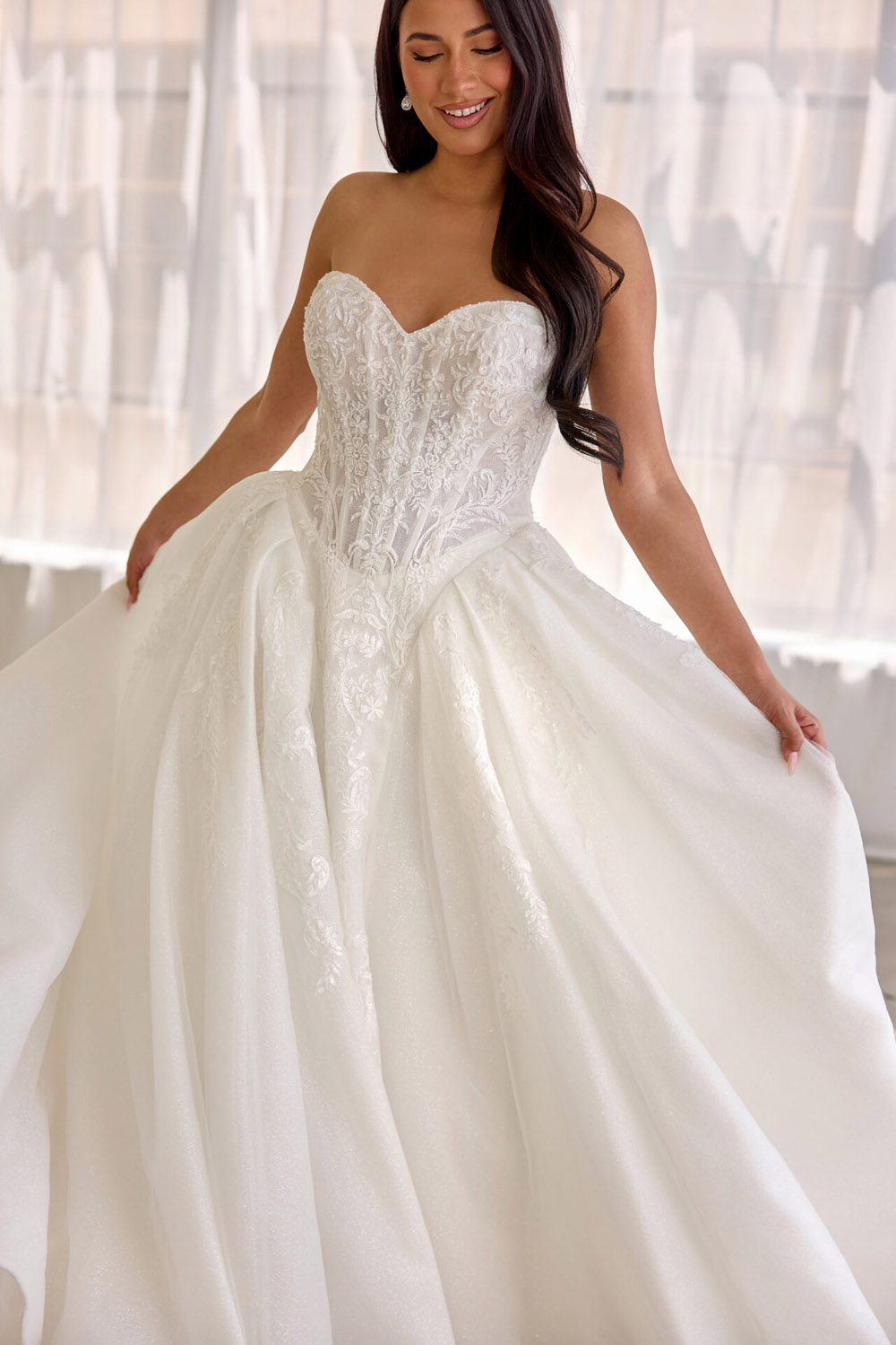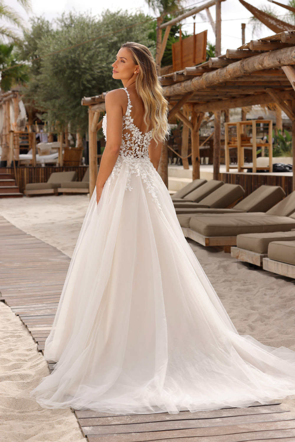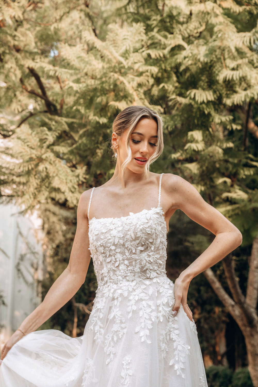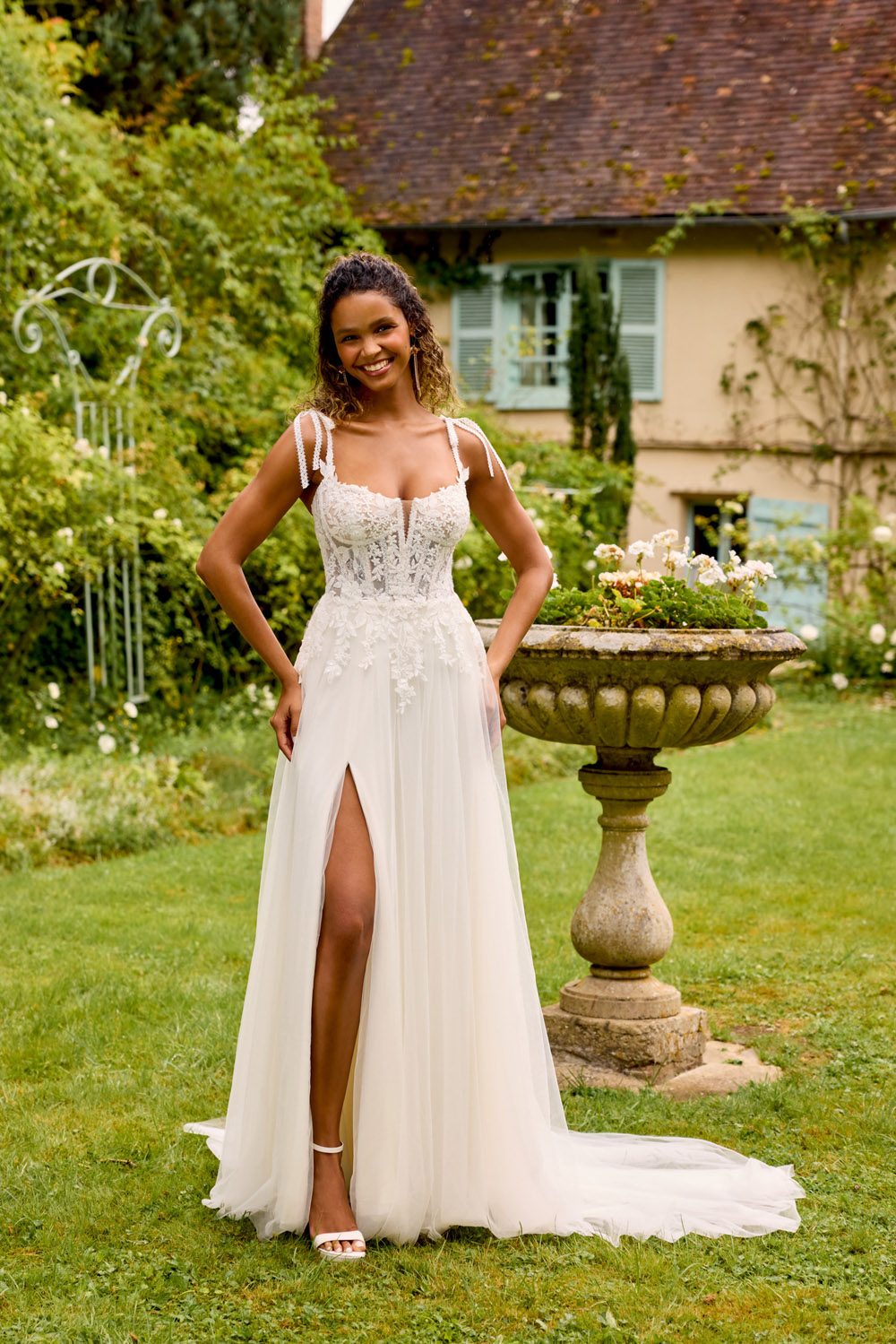 Die A-Linie erfreut sich als Schnitt bei Brautkleidern größter Beliebtheit. Es handelt sich um eine klassische Silhouette, die am Oberkörper eng anliegt und ab der Taille nach unten hin ausgestellt ist, ähnlich dem Buchstaben „A“. Diese Schnittform schmeichelt den meisten Körpertypen, indem sie die Taille betont und geschickt die Hüften, sowie Oberschenkel umspielt.