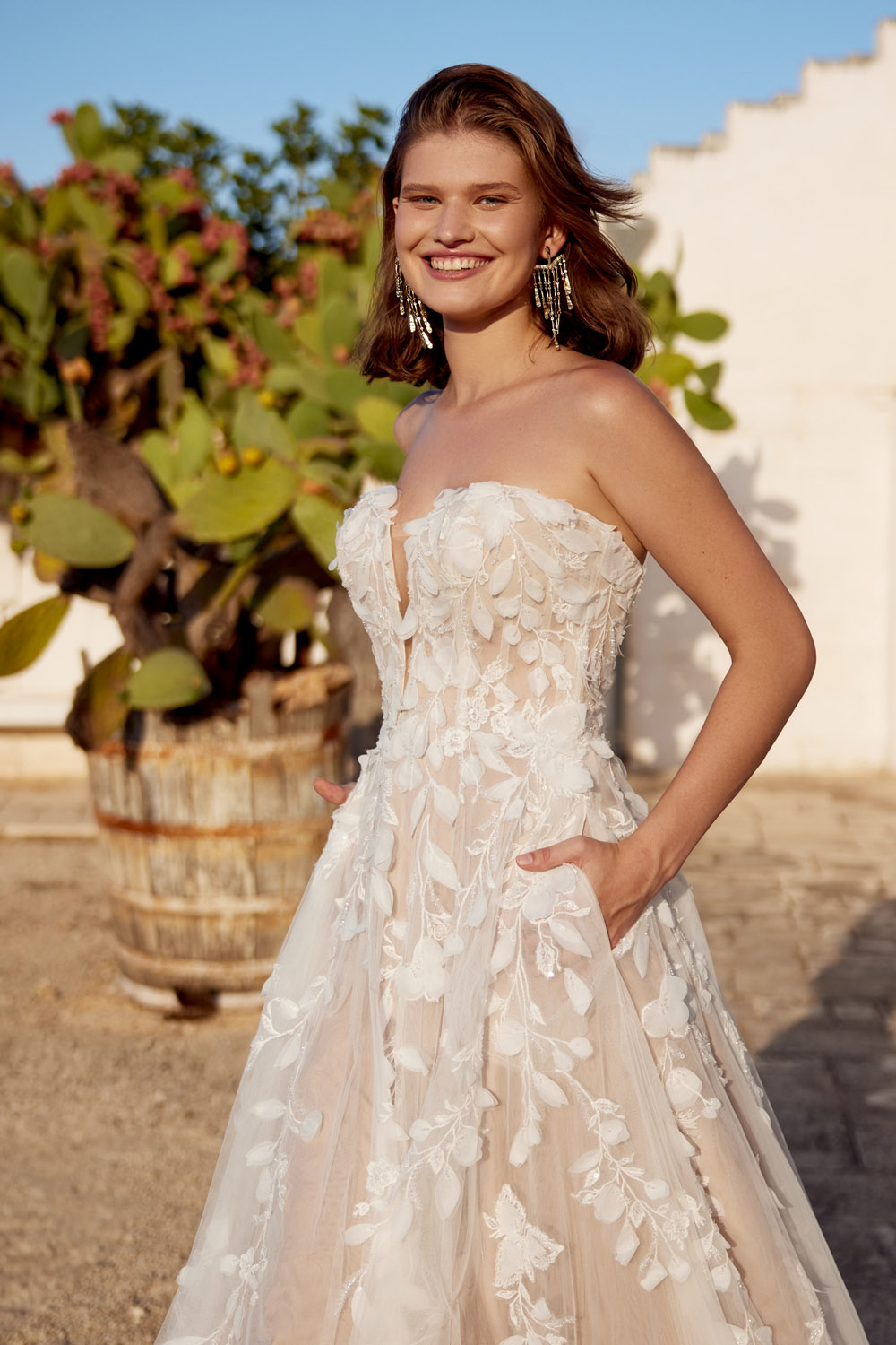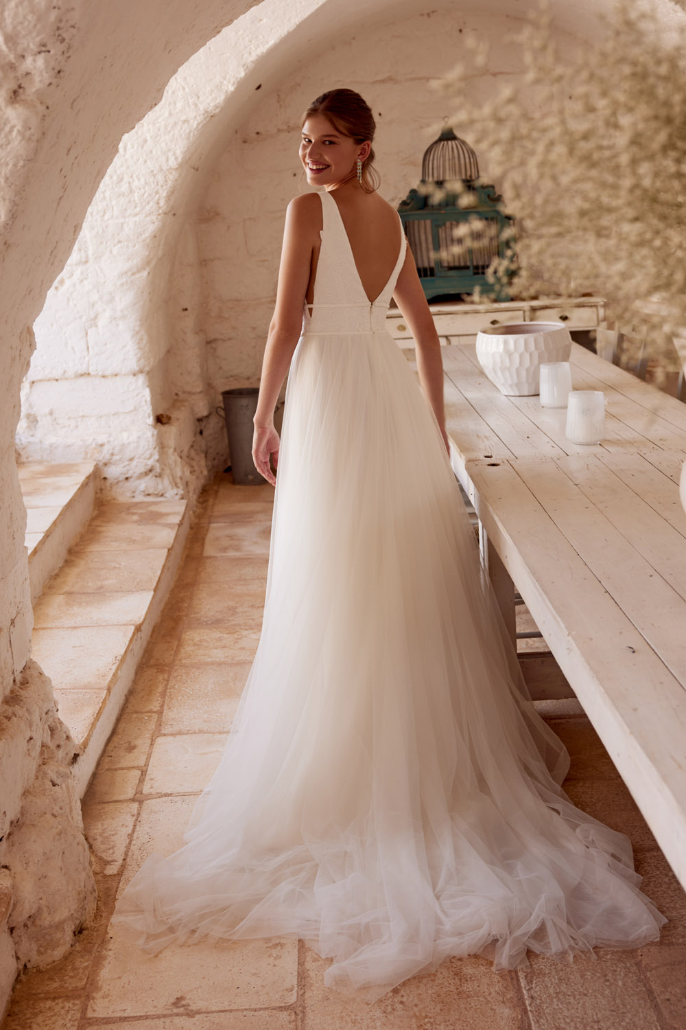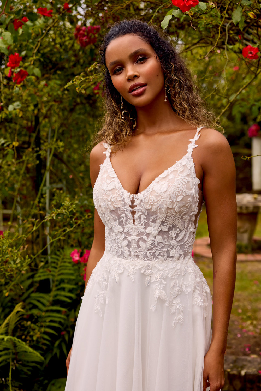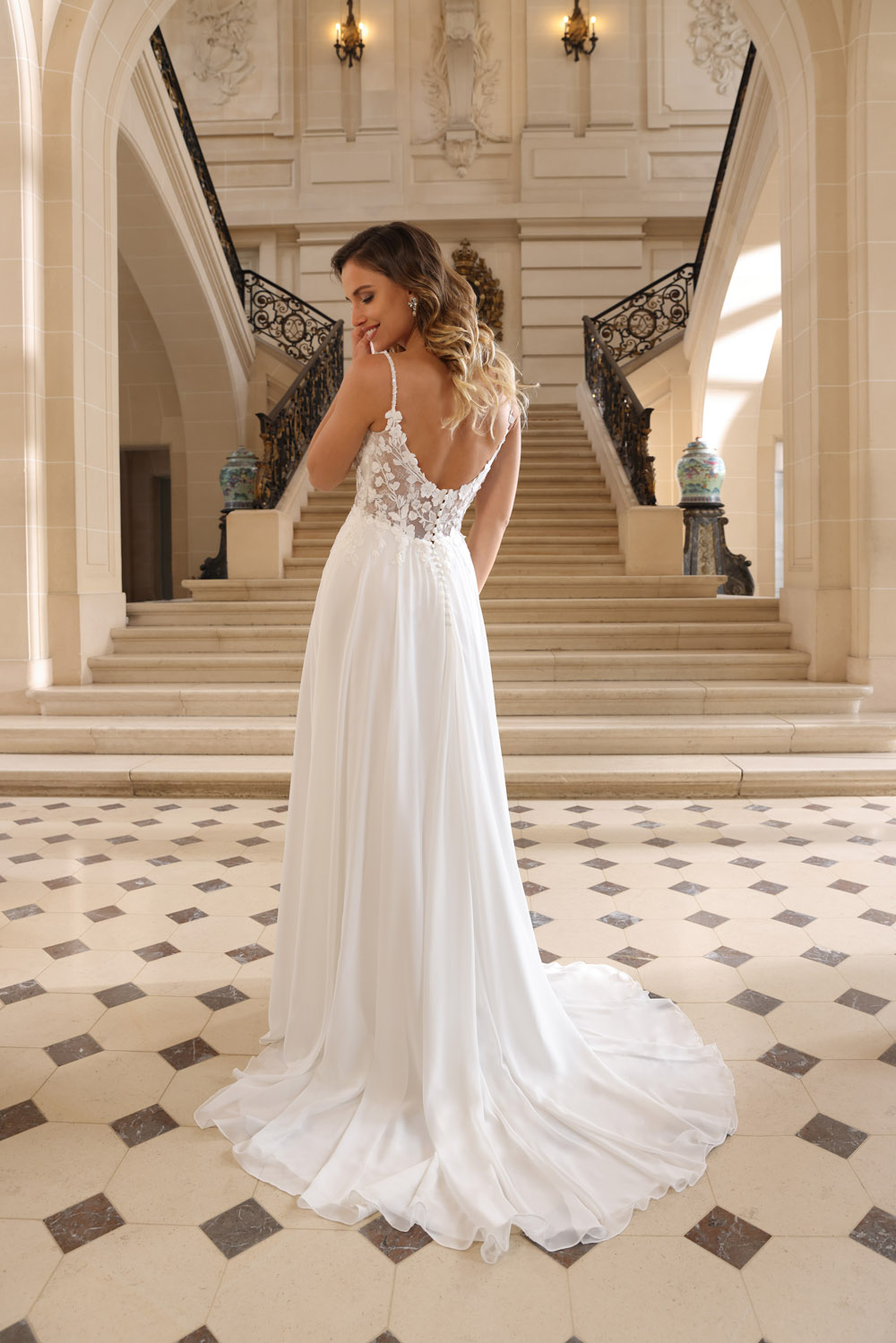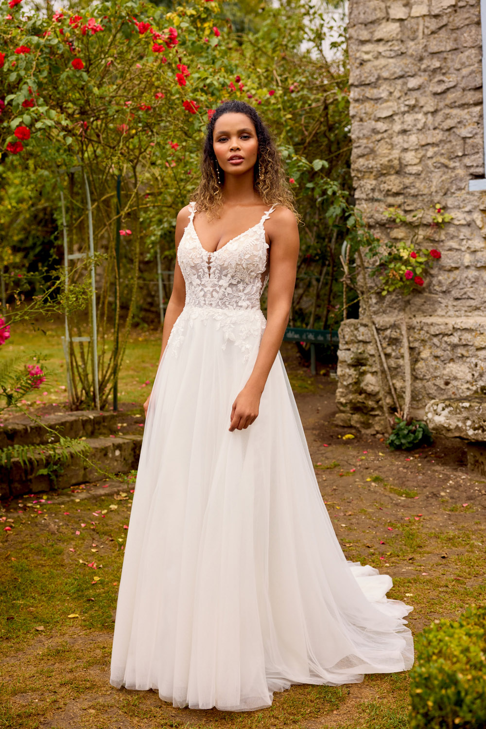 Die A-Linie erfreut sich als Schnitt bei Brautkleidern größter Beliebtheit. Es handelt sich um eine klassische Silhouette, die am Oberkörper eng anliegt und ab der Taille nach unten hin ausgestellt ist, ähnlich dem Buchstaben „A“. Diese Schnittform schmeichelt den meisten Körpertypen, indem sie die Taille betont und geschickt die Hüften, sowie Oberschenkel umspielt.