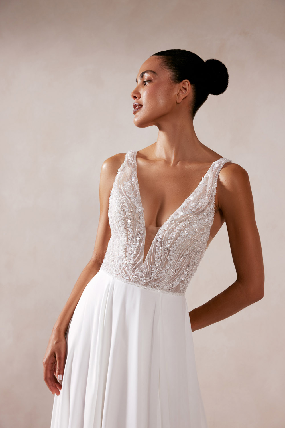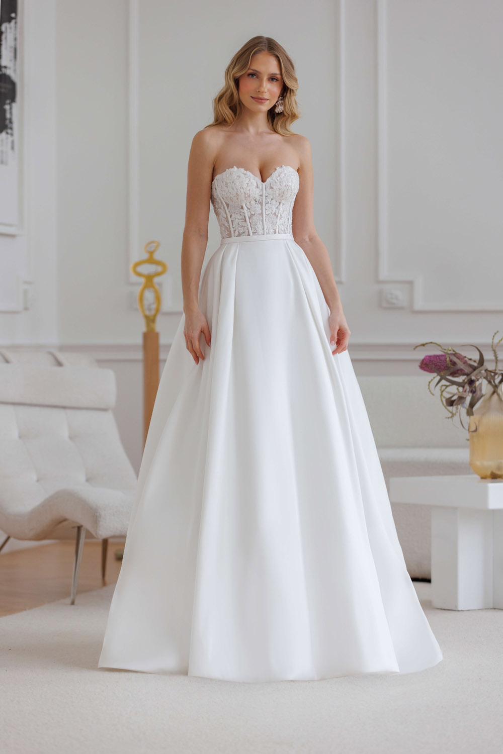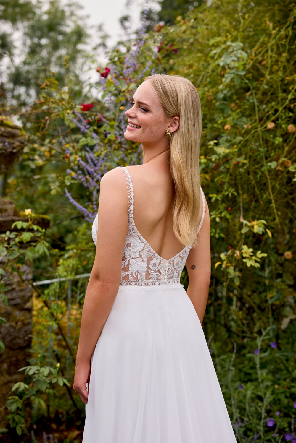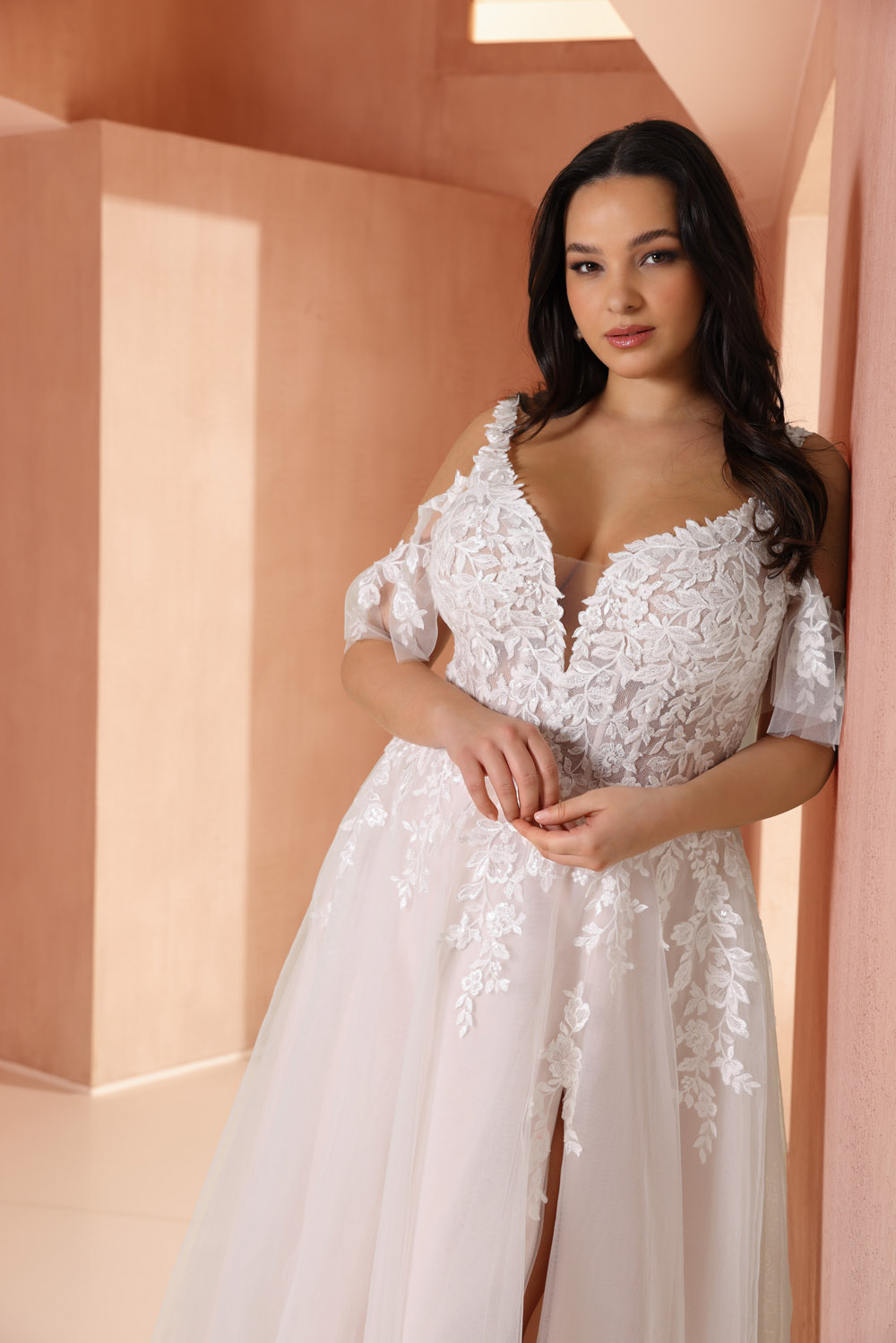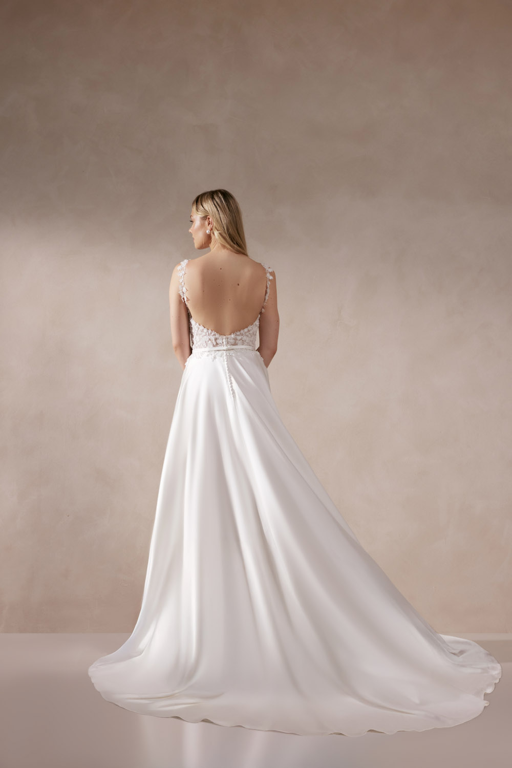 Die A-Linie erfreut sich als Schnitt bei Brautkleidern größter Beliebtheit. Es handelt sich um eine klassische Silhouette, die am Oberkörper eng anliegt und ab der Taille nach unten hin ausgestellt ist, ähnlich dem Buchstaben „A“. Diese Schnittform schmeichelt den meisten Körpertypen, indem sie die Taille betont und geschickt die Hüften, sowie Oberschenkel umspielt.