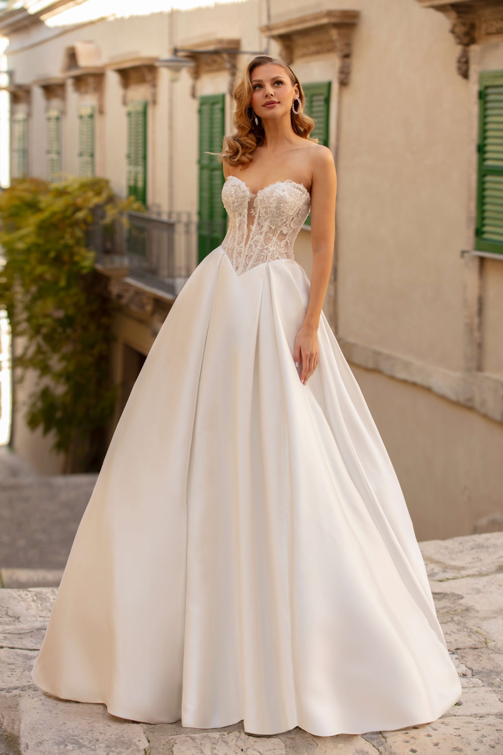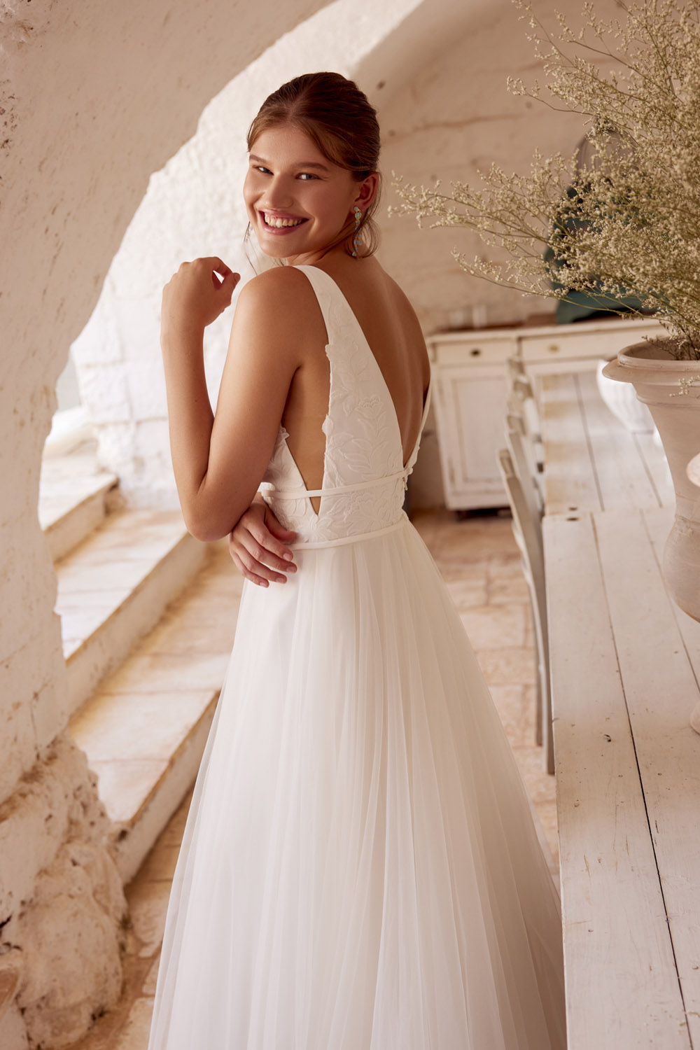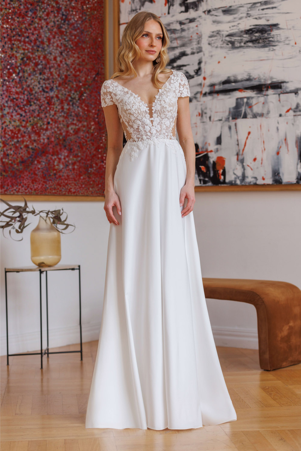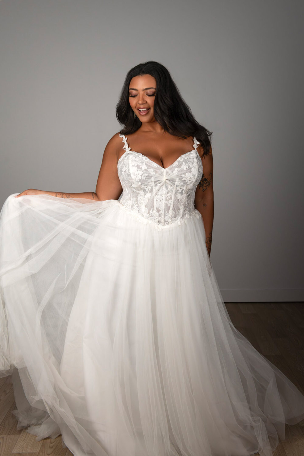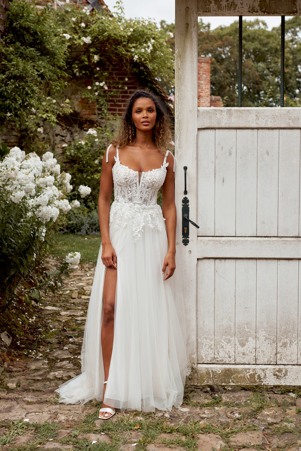 Die A-Linie erfreut sich als Schnitt bei Brautkleidern größter Beliebtheit. Es handelt sich um eine klassische Silhouette, die am Oberkörper eng anliegt und ab der Taille nach unten hin ausgestellt ist, ähnlich dem Buchstaben „A“. Diese Schnittform schmeichelt den meisten Körpertypen, indem sie die Taille betont und geschickt die Hüften, sowie Oberschenkel umspielt.