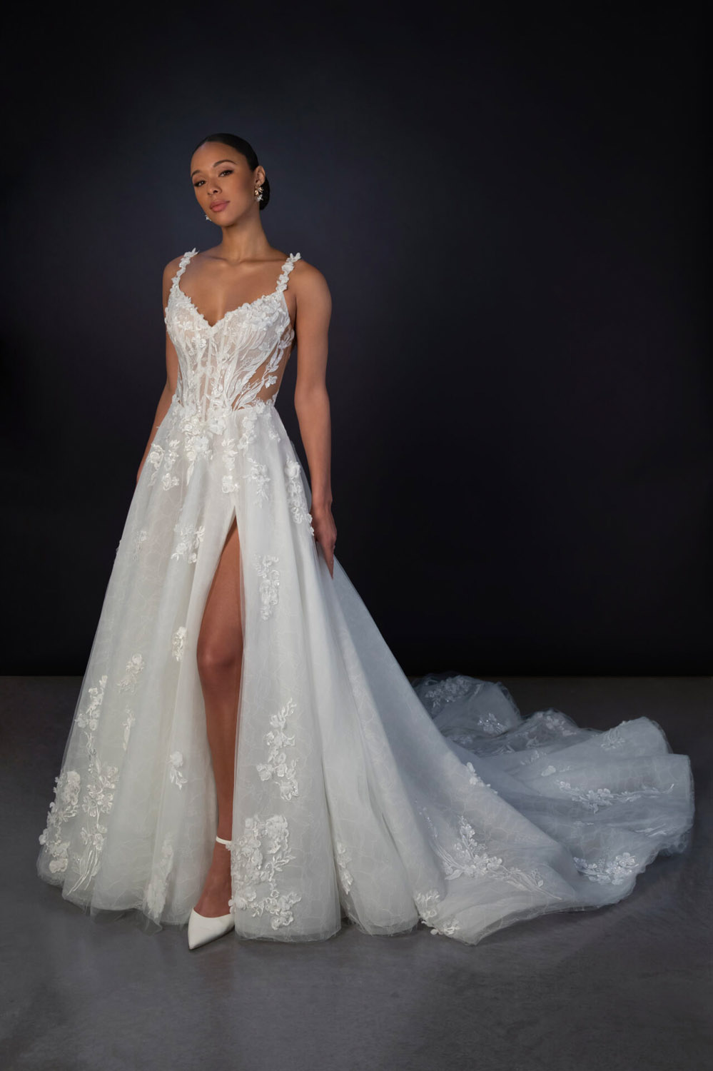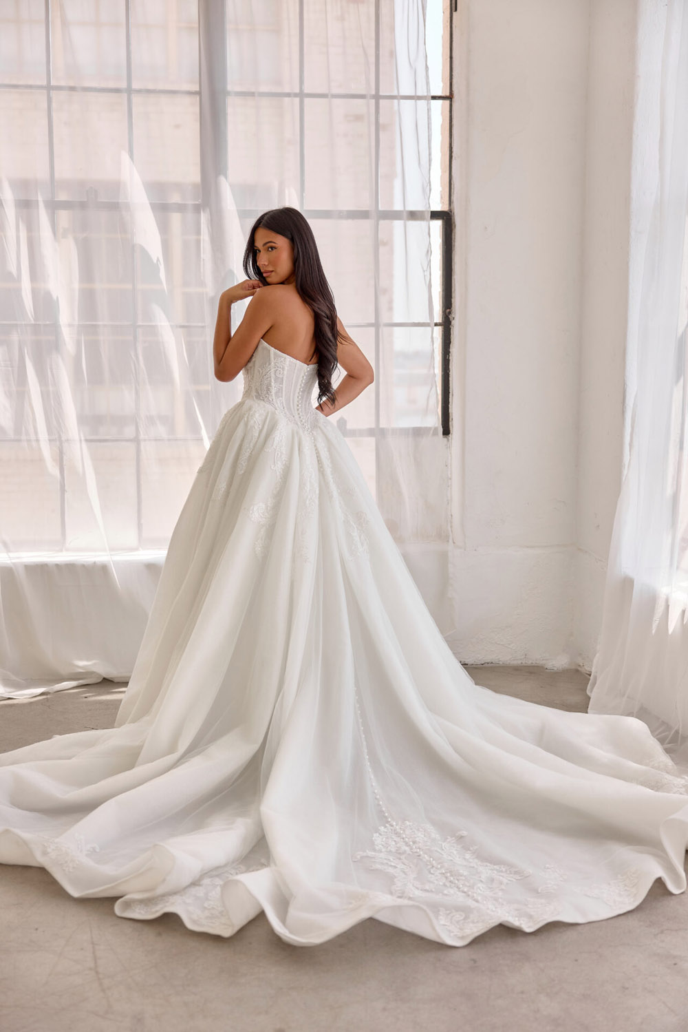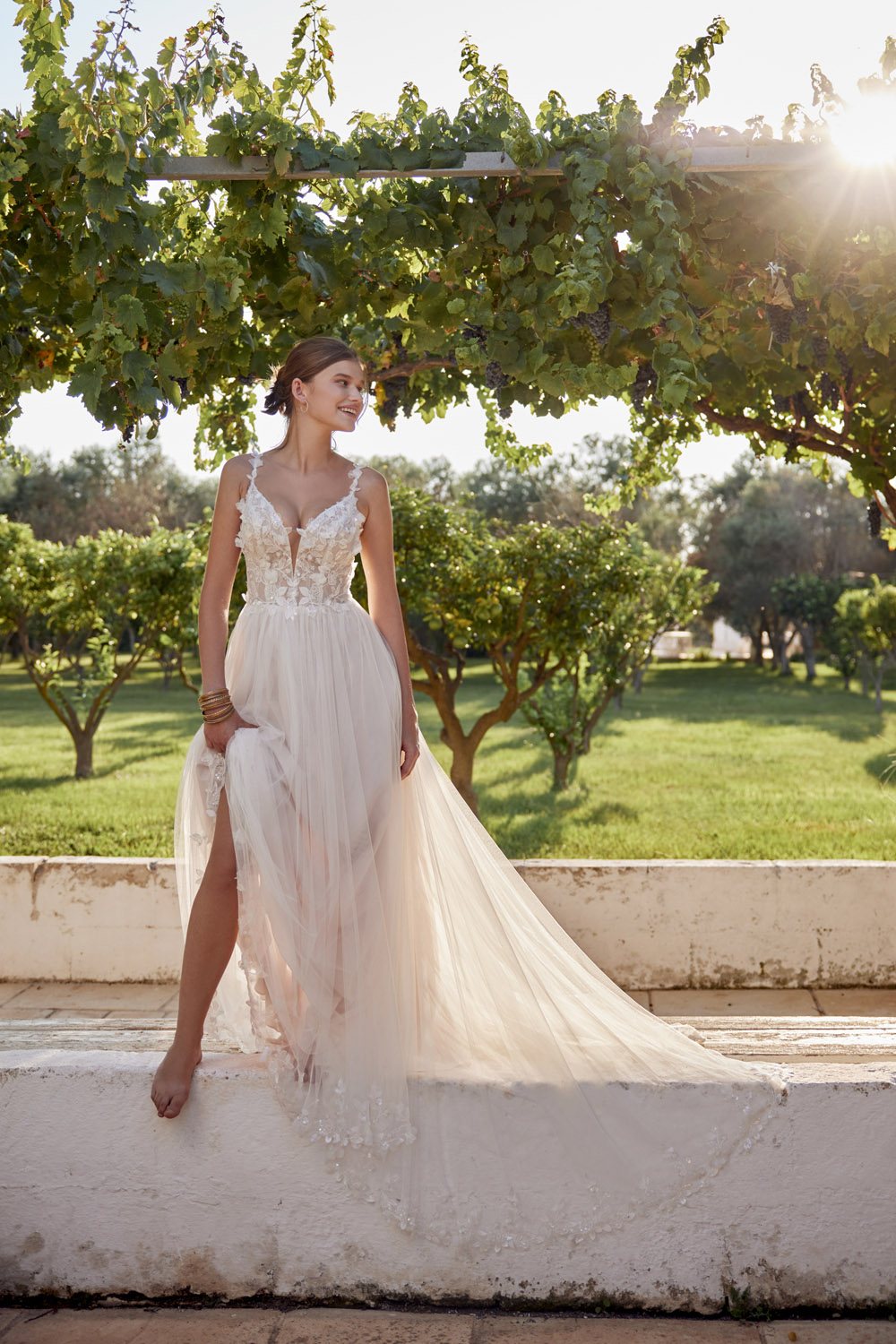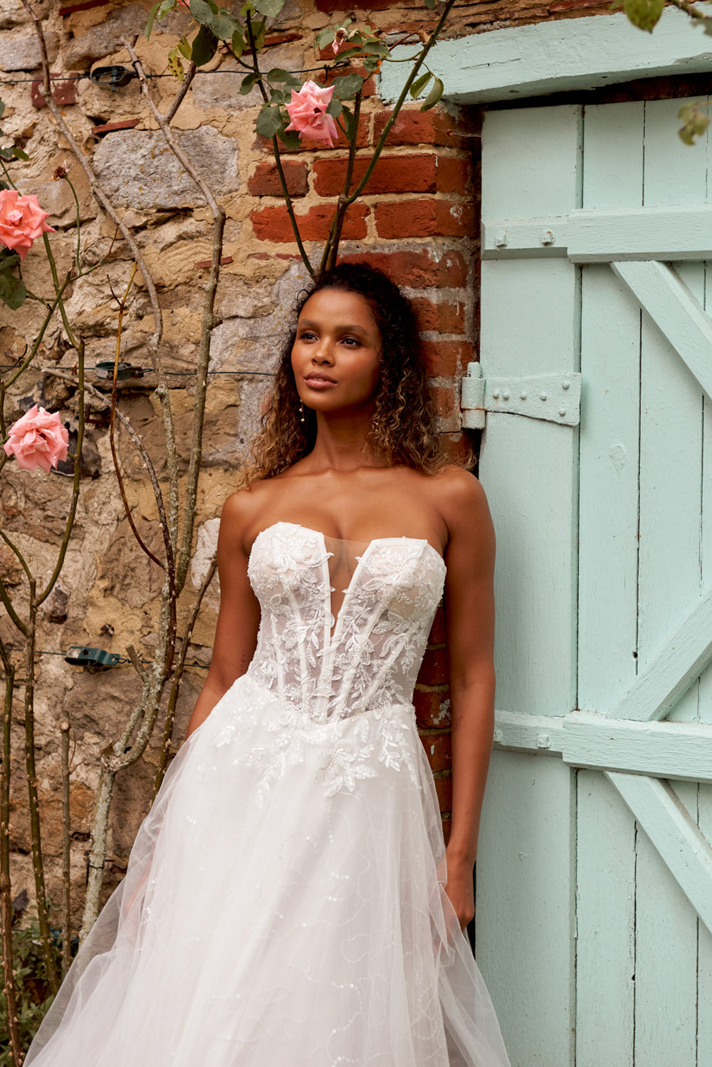 Die A-Linie erfreut sich als Schnitt bei Brautkleidern größter Beliebtheit. Es handelt sich um eine klassische Silhouette, die am Oberkörper eng anliegt und ab der Taille nach unten hin ausgestellt ist, ähnlich dem Buchstaben „A“. Diese Schnittform schmeichelt den meisten Körpertypen, indem sie die Taille betont und geschickt die Hüften, sowie Oberschenkel umspielt.