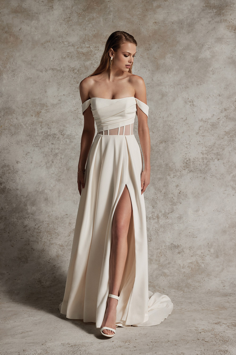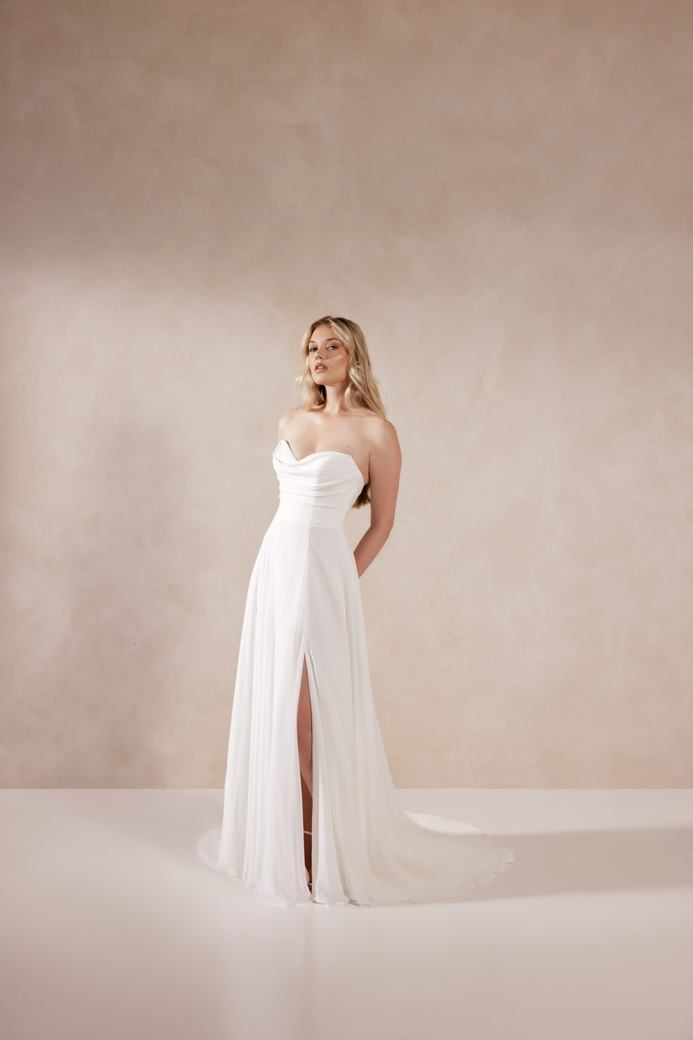 Klare Linien, dezente Verzierungen und hochwertige Stoffe verleihen den schlichten Brautkleidern eine zeitlose Anmutung.